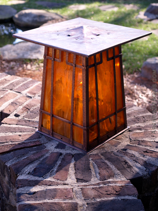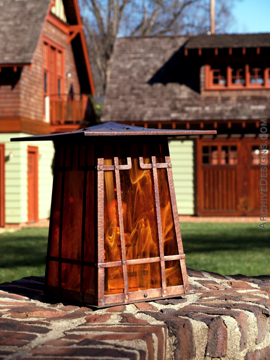 An elegant exterior lantern in copper and caramel-swirl glass for a home in Charlotte, North Carolina. We made several pieces for this home including two fireplace screens, several lanterns and a kitchen hood. Pausing to view this lantern brings on a deep sense of reflection and moods of memory, to a time when the new convenience of electricity was a striking novelty and extraordinary blessing...