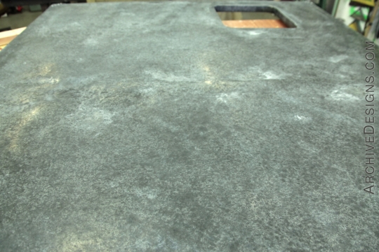 Unique zinc island countertop, with opening for undermount sink, in progress in our shop. The zinc surface shows the careful handwork that went into the piece, and has a gorgeous mottled antique patina. Working with zinc has its own set of challenges, but the stand-out final effect can be well worth the effort for a piece that is placed in just the right setting.